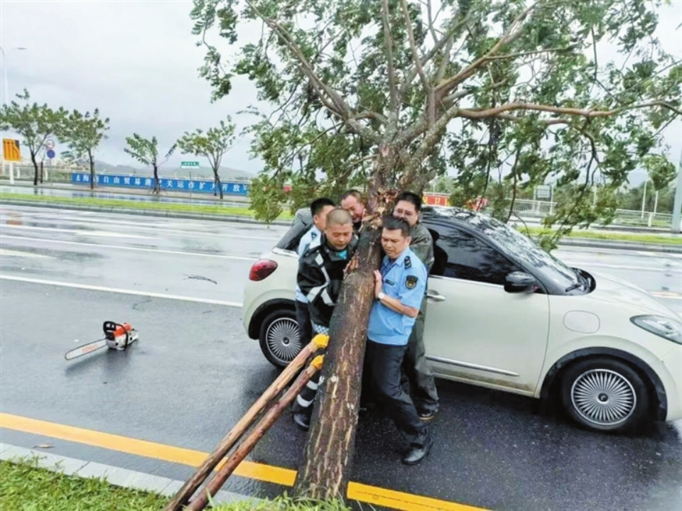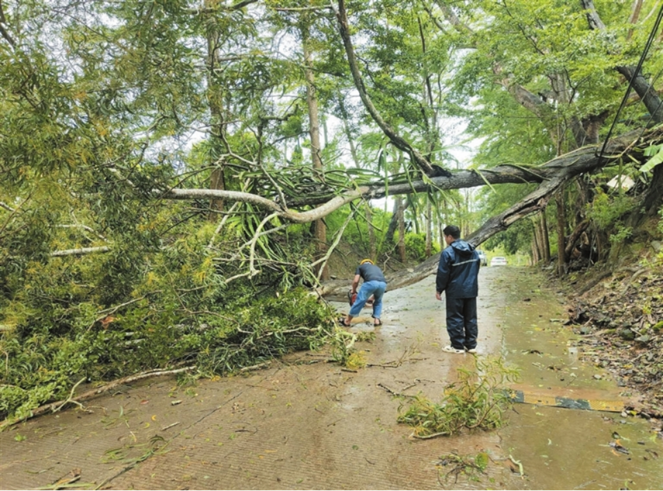 市综合行政执法局海棠分局执法人员全面排查整治户外广告、高空设施、倒伏树木等隐患,动态监测桥梁、隧道等易积水点和易损、地势低洼道路,加大河道、海域、水库等存在安全隐患水域巡查力度,切实筑牢防汛防风安全屏障。