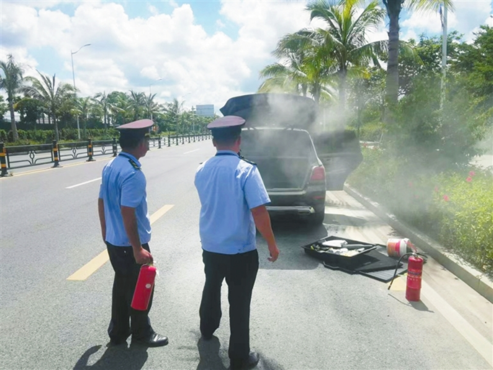 “多亏你们及时出手,不然我的车和人都危险了!”近日,在三亚鹿城大道与海润路路口附近,车主李先生紧紧握住市综合行政执法局吉阳分局(简称“吉阳分局”)执法队员的手,连声道谢。原来,他驾驶的车辆突发自燃,危急时刻,正在巡查的“执法蓝”化身“消防员”,迅速扑灭火情,避免了更大损失。