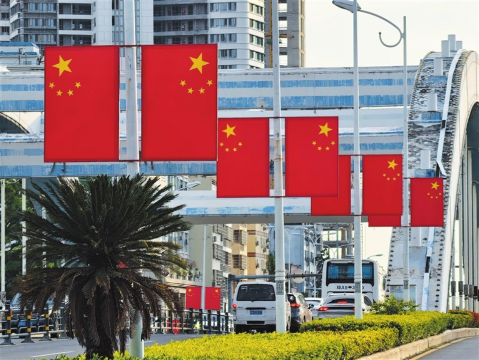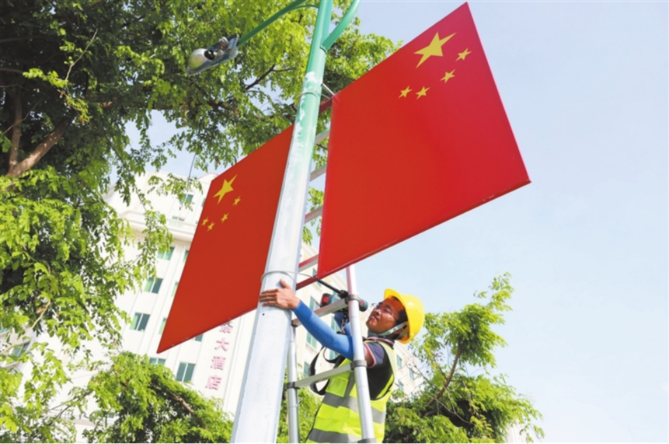 9月25日,随着国庆中秋“双节”的脚步日益临近,三亚市的大街小巷陆续换上了节日的“盛装”,一面面鲜艳的五星红旗被悬挂在街头,营造出浓厚的国庆氛围。