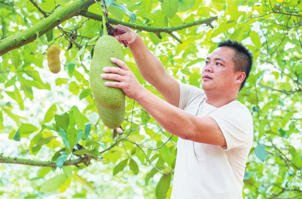 在育才生态区马脚村榴莲蜜生产基地内,工人正在采摘榴莲蜜。