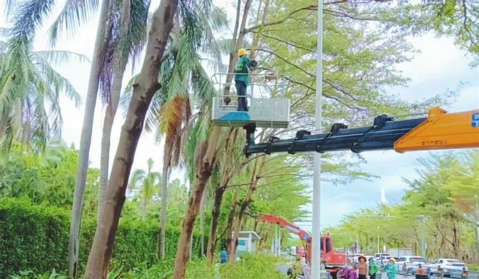 天涯区园林绿化部门对重点路段进行树木修剪和加固作业。
