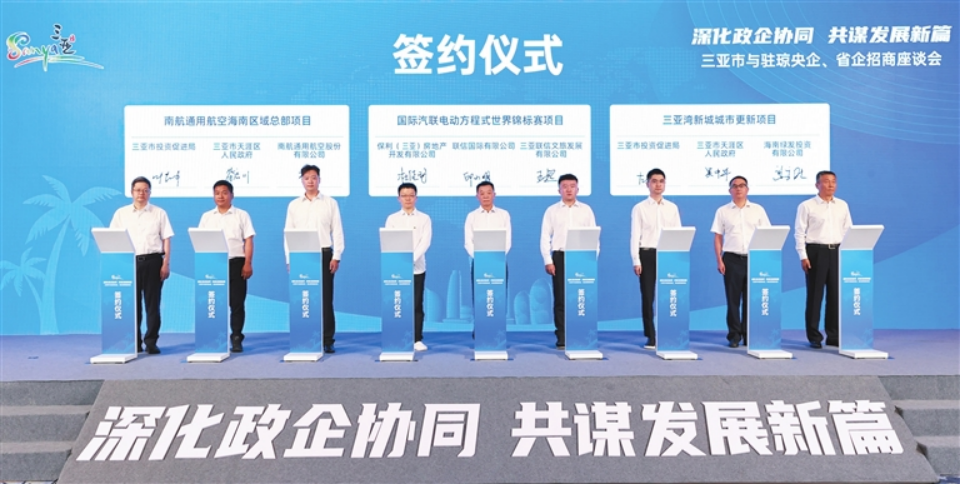 9月28日,在三亚市与驻琼央企、省企招商座谈会上,6个重点项目集中签约,这些项目涵盖低空经济、城市更新、国际教育、医疗器械等重点产业领域,将为三亚实体经济提质升级注入新动能。