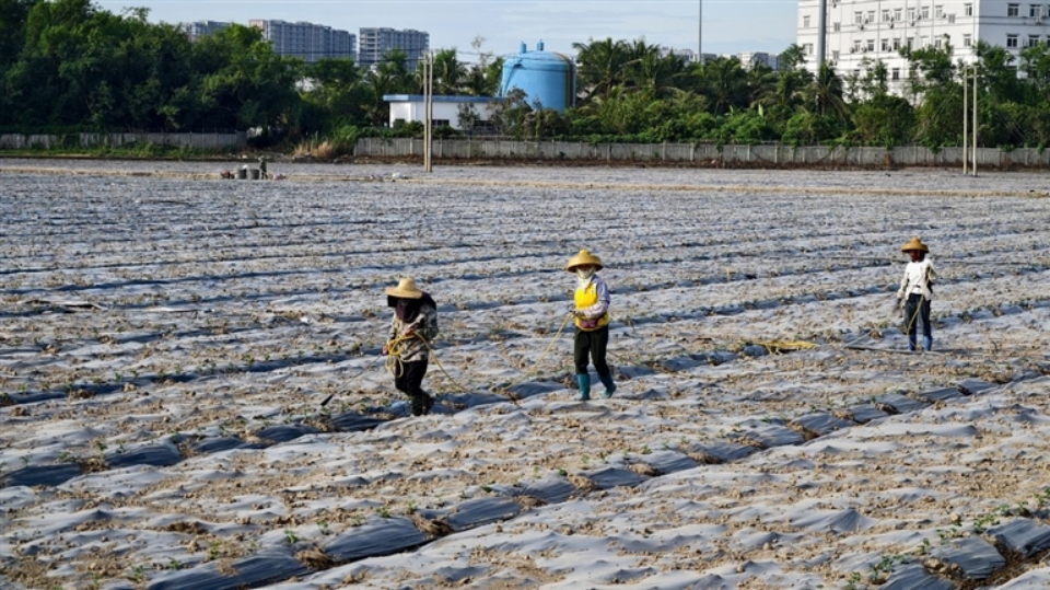 11月24日,在三亚市天涯区槟榔村田洋,农民正忙着给豇豆幼苗浇水。当日,三亚市天涯区槟榔村、妙林村的田洋里一片繁忙景象。阳光下,农民分散在田间各处,翻土、播种、灌溉等工序有条不紊地推进,身影在田垄间不停穿梭,用忙碌的身影勾勒出冬日里的生产画卷。