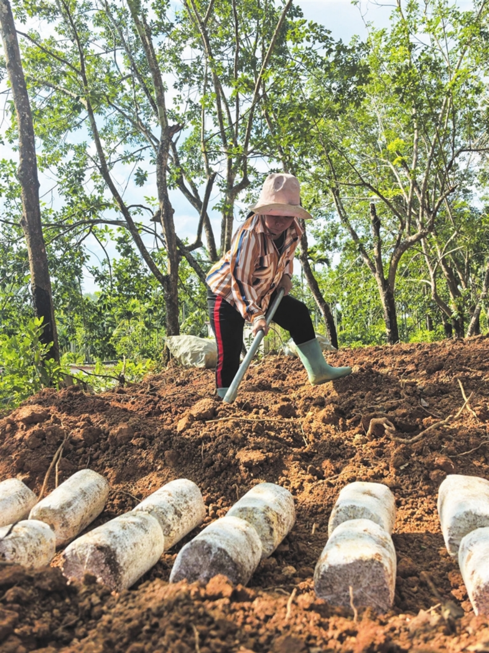 清晨的阳光透过橡胶树叶的缝隙,洒在种植基地里,村民陈彩丽和工友们正忙着摆放菌棒,手里的活儿有条不紊。