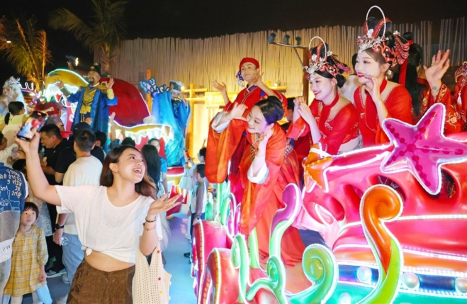 近日,在“看见三亚”夜游活动中,盛装打扮的演员在花车上与游客热情互动。记者 李学仕 摄