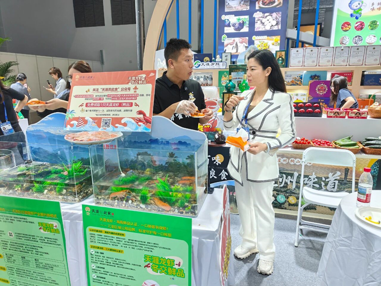其中,“天涯龙虾”品牌成为全场焦点。这款产自天涯区抱前村的红螯螯虾,是稻虾综合种养模式的典范,兼具生态效益与经济效益。在展会现场,龙虾活体展示与厨艺品鉴,让参展嘉宾亲身领略其鲜甜品质。冬交会首日即成功与7家优质采购商达成采购意向,市场潜力备受瞩目。