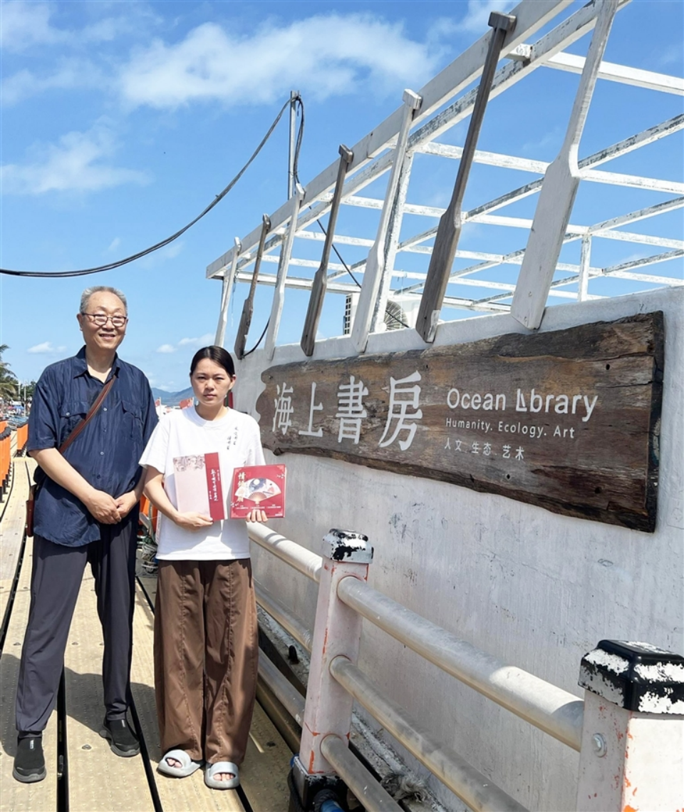 雷建德(老者)向西岛“海上书房”捐赠《西厢记》系列书籍画册。