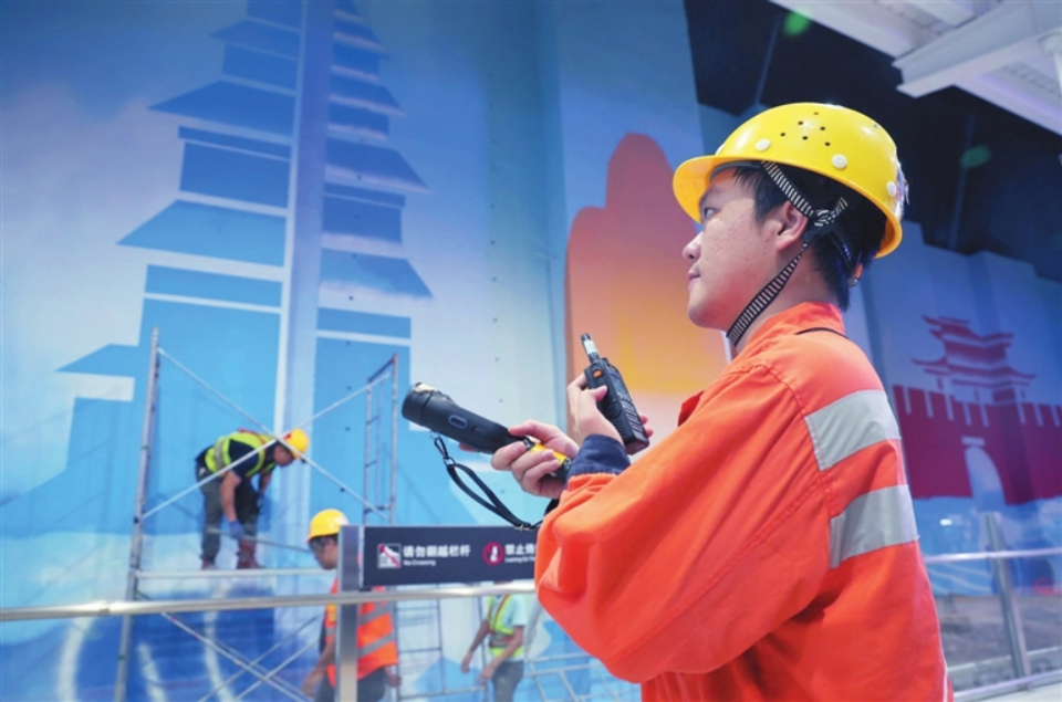 天窗是铁路行业术语,指在列车运行图中不铺画列车运行线、专为施工维修预留的时间窗口。夜深人静时,两座车站的作业现场却灯火通明。自项目启动以来,在共计45个“天窗”时段里,海南铁路海口房建公寓段职工每晚10时30分准时集结出发,分赴三亚站和天涯海角站持续奋战至次日凌晨4时30分,为画师们安全、高效地完成壁画创作提供充足的时间窗口。