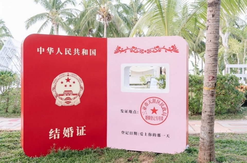 该登记处坐落于三亚湾10号停车场旁,与鹿回头婚姻登记处遥相呼应,寓意“山盟海誓”。登记处功能区域划分清晰且非常温馨。一层为核心办事大厅,设有结婚登记窗口、舒适的候登区、填表区及私密的婚姻家庭辅导室。二层设置了中、西两座风格迥异的颁证厅:西式厅以蔚蓝海洋为主题,与窗外的碧海蓝天融为一体;中式厅则充满古韵国风。连接两厅的走廊及户外露台,更是化身为“爱情艺术廊”,LOVE墙、巨型玫瑰、“我爱你”彩绘墙以及散落在绿茵中的大型户外打卡装置——如巨型结婚证、“囍”字等,无一不为新人记录幸福瞬间提供了绝佳背景。